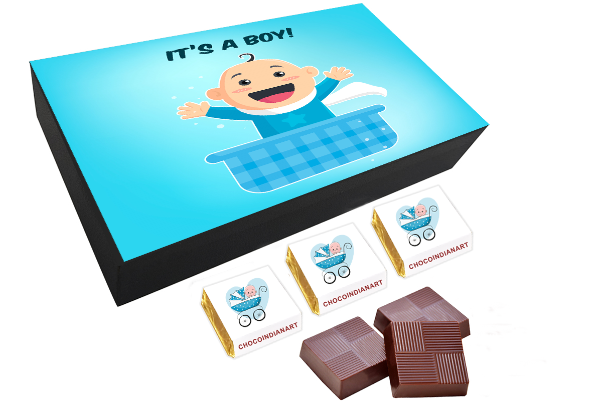 You will get a Baby Boy light wooden box with all wrapper printed chocolates. There is also a Baby Boy message printed on Message paper inside the box.