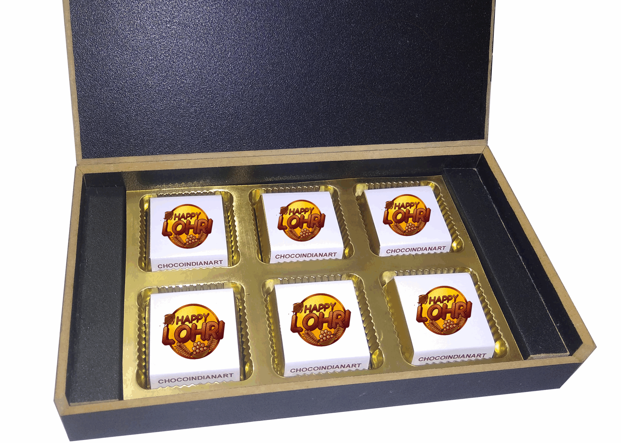 You will get a Happy Lohri Day Black wooden box with all wrapper printed chocolates. There is also a Happy Lohri message printed on Message paper inside the box.
