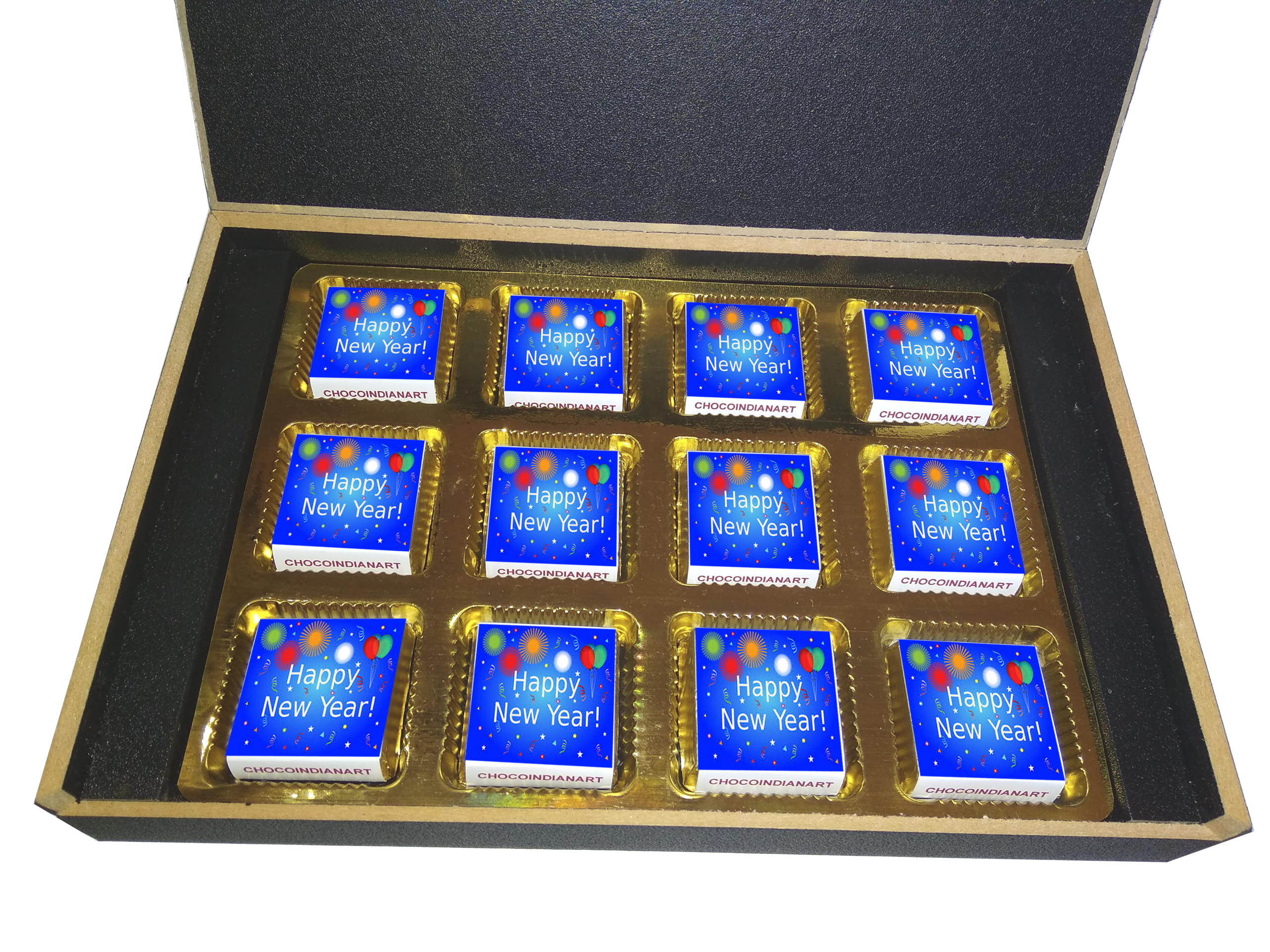 You will get a Happy New Year light wooden box with all wrapper printed chocolates. There is also a Happy New Year message printed on Message paper inside the box.