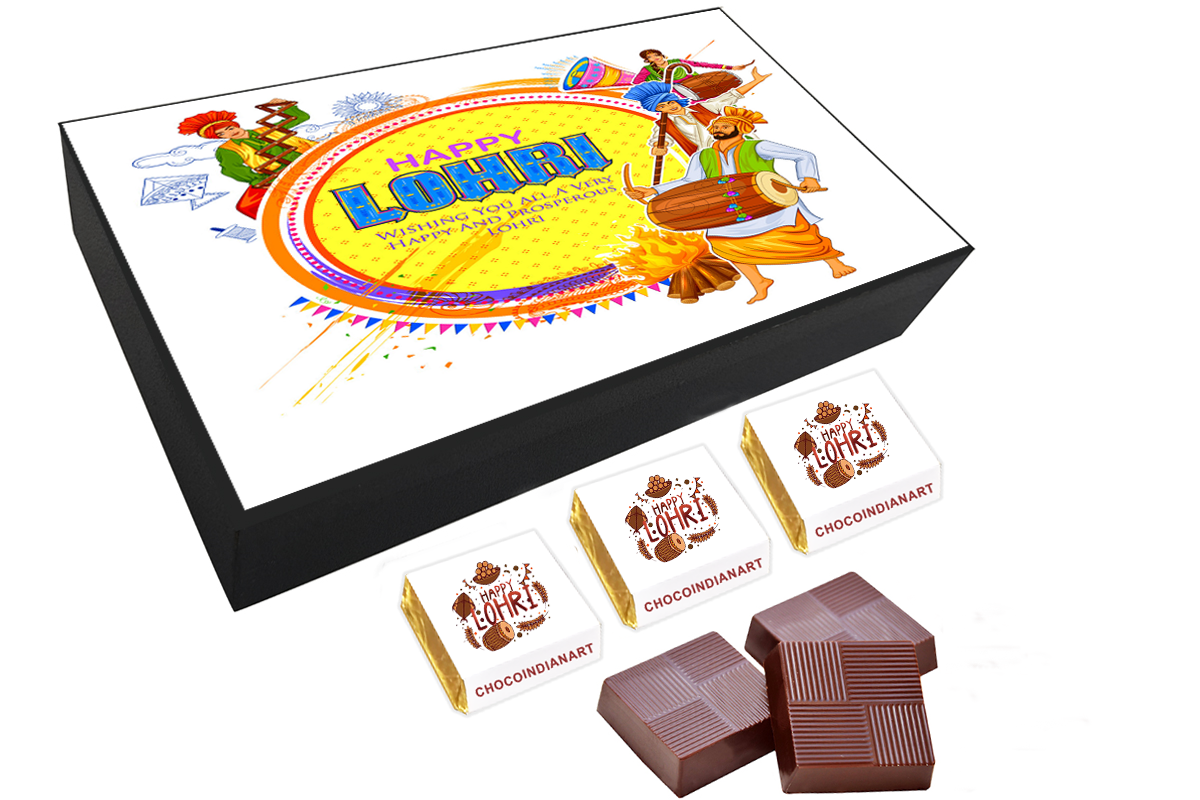 You will get a Happy Lohri Day Black wooden box with all wrapper printed chocolates. There is also a Happy Lohri message printed on Message paper inside the box.