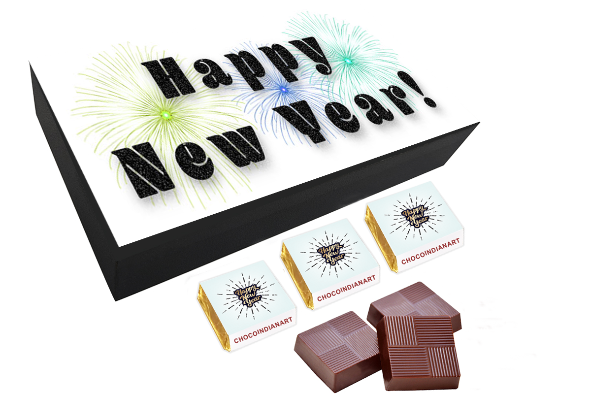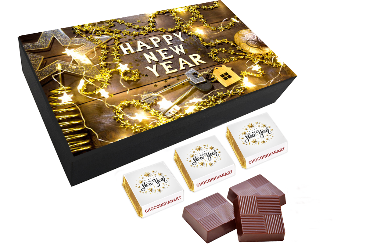 You will get a Happy New Year light wooden box with all wrapper printed chocolates. There is also a Happy New Year message printed on Message paper inside the box.