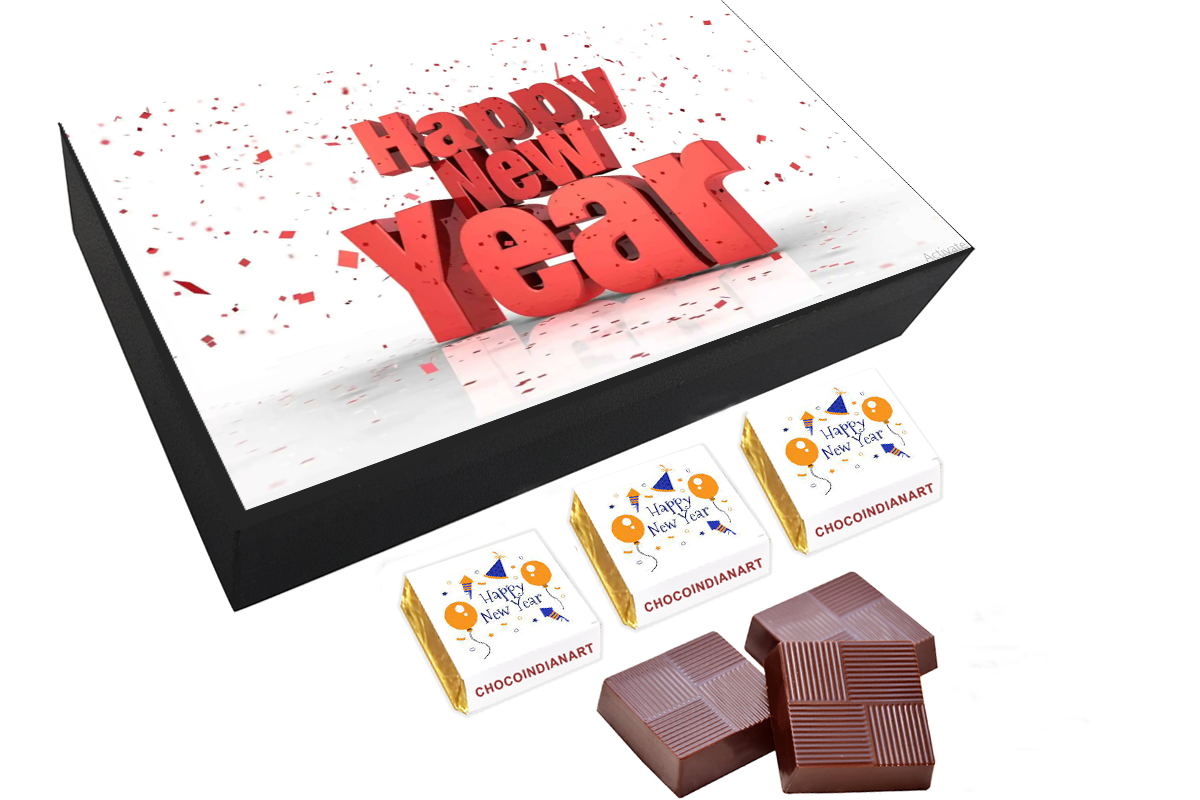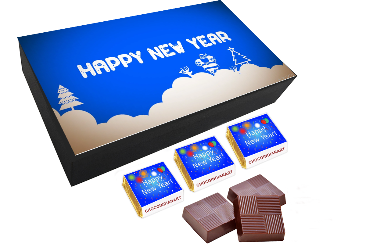 You will get a Happy New Year light wooden box with all wrapper printed chocolates. There is also a Happy New Year message printed on Message paper inside the box.