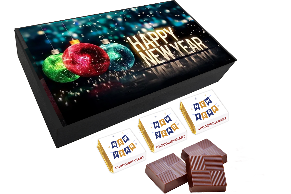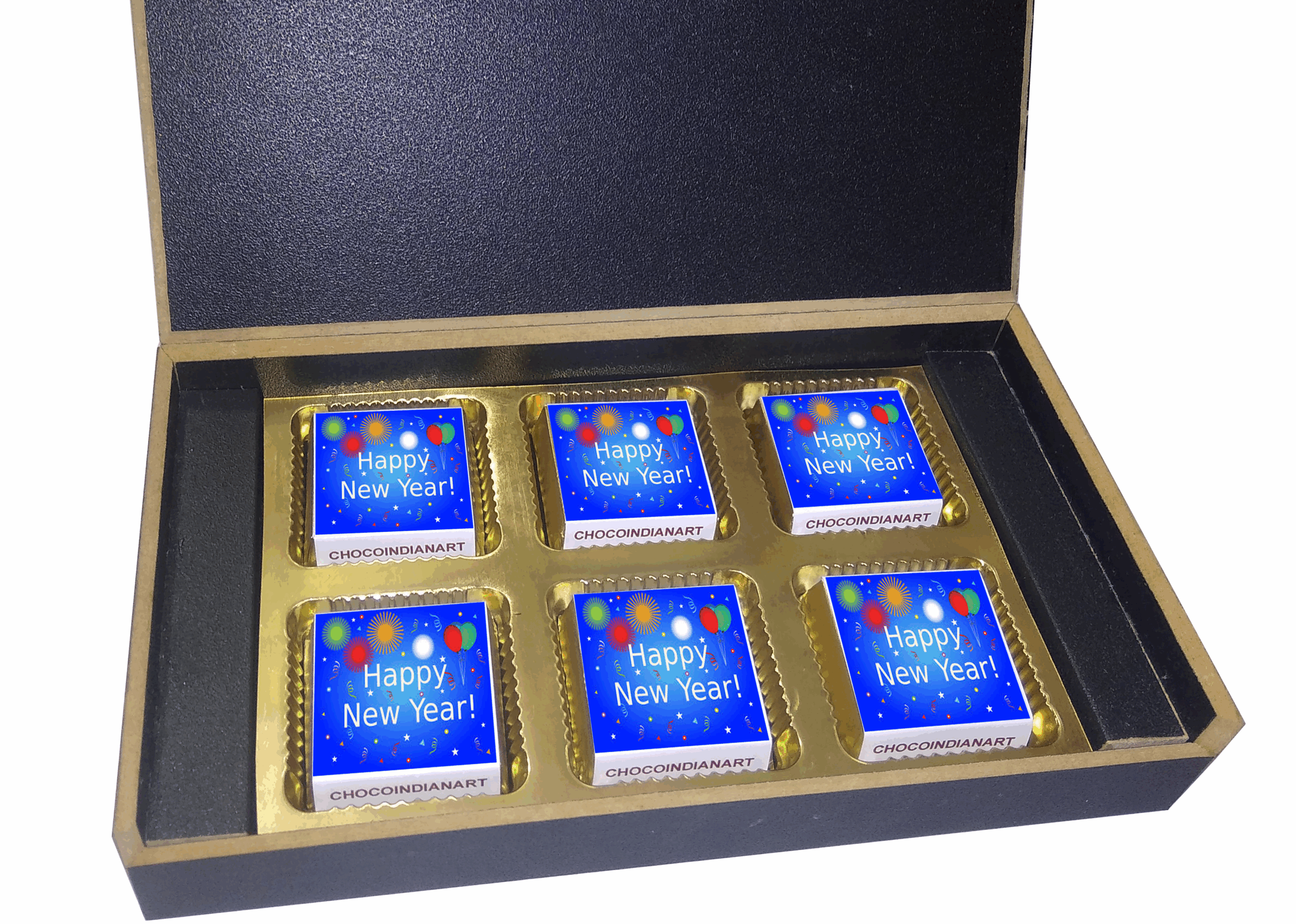 You will get a Happy New Year light wooden box with all wrapper printed chocolates. There is also a Happy New Year message printed on Message paper inside the box.