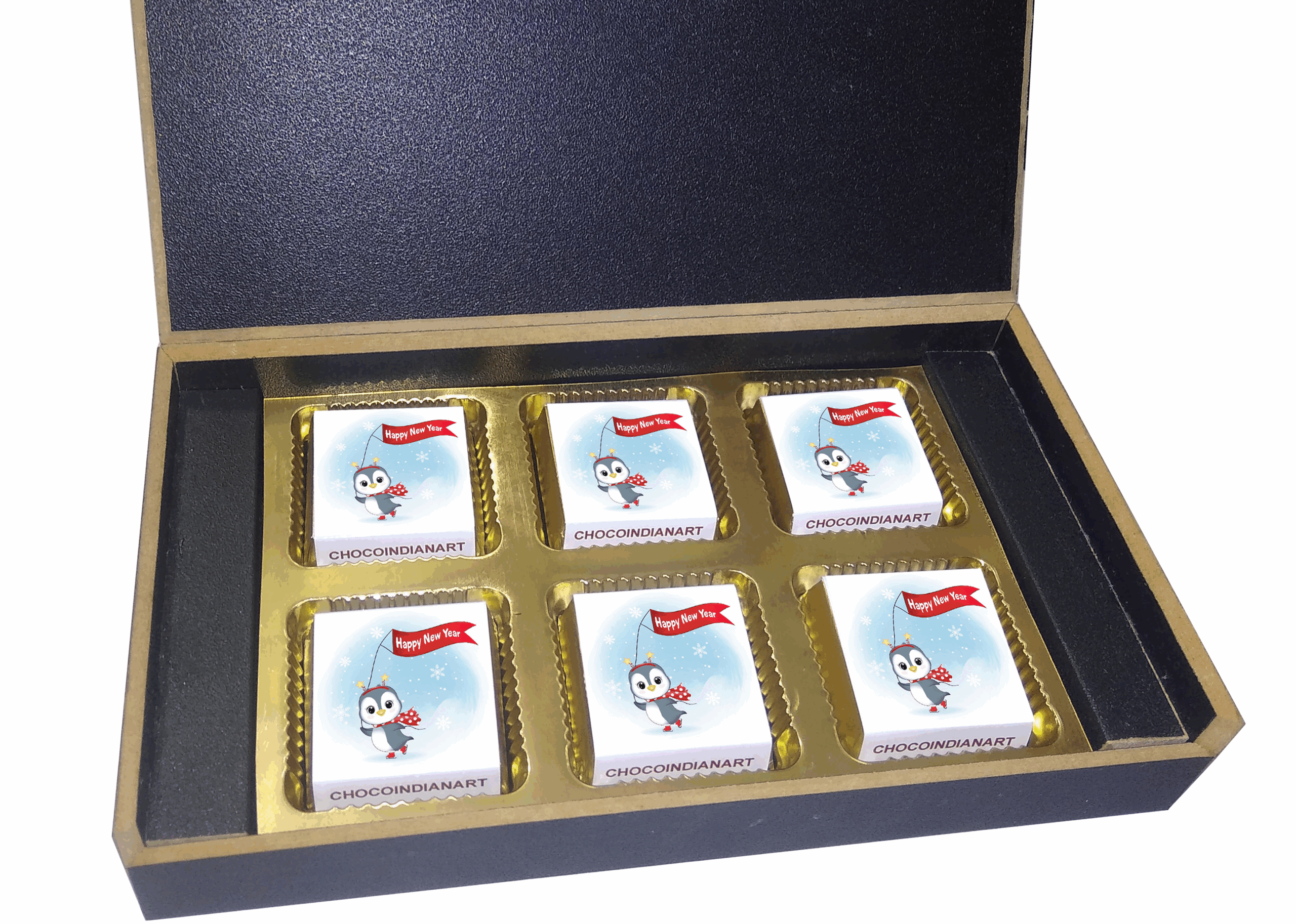 You will get a Happy New Year light wooden box with all wrapper printed chocolates. There is also a Happy New Year message printed on Message paper inside the box.