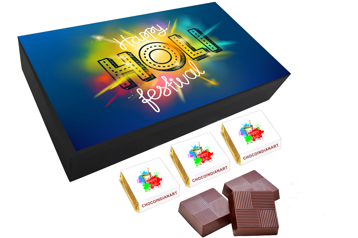You will get a Happy HOLI Black wooden box with all wrapper printed chocolates. There is also a Happy HOLI message printed on Message paper inside the box.