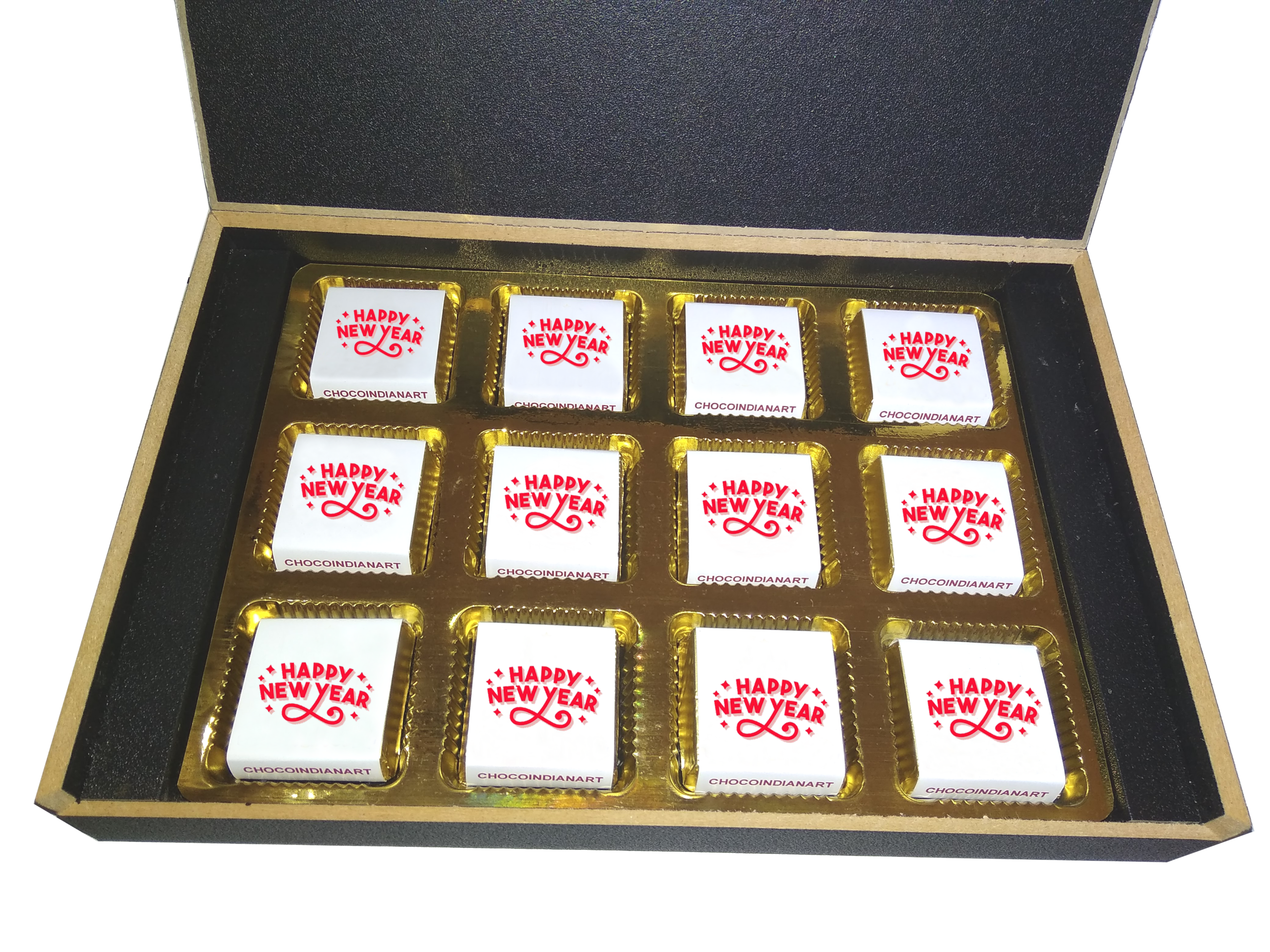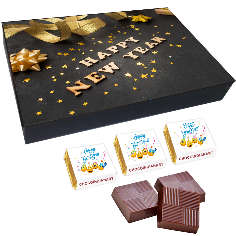 You will get a Happy New Year light wooden box with all wrapper printed chocolates. There is also a Happy New Year message printed on Message paper inside the box.